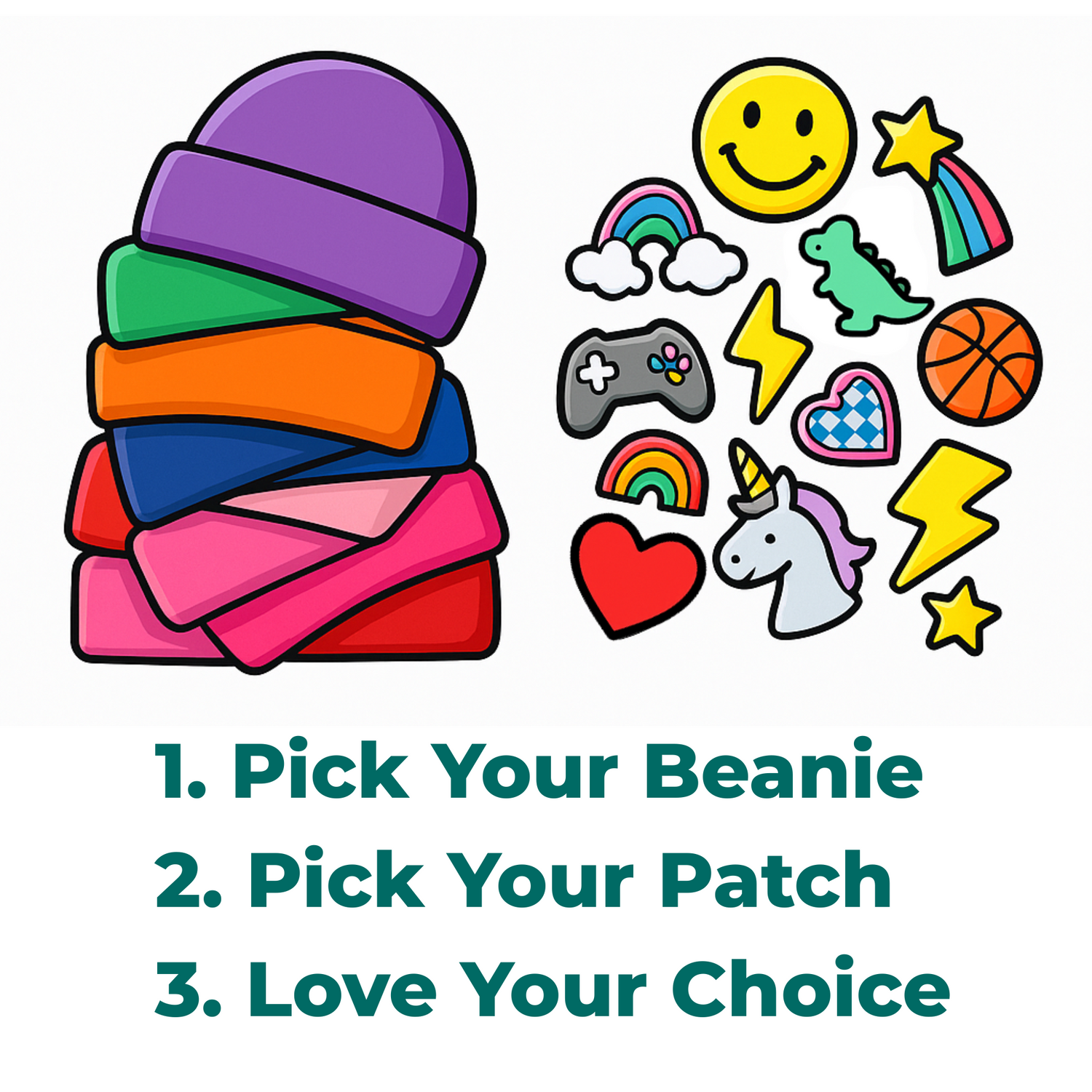It’s super easy! First, you pick the colour of beanie you like best. Then you pick a patch from our collection. We put it all together for you so your beanie is unique just like you!